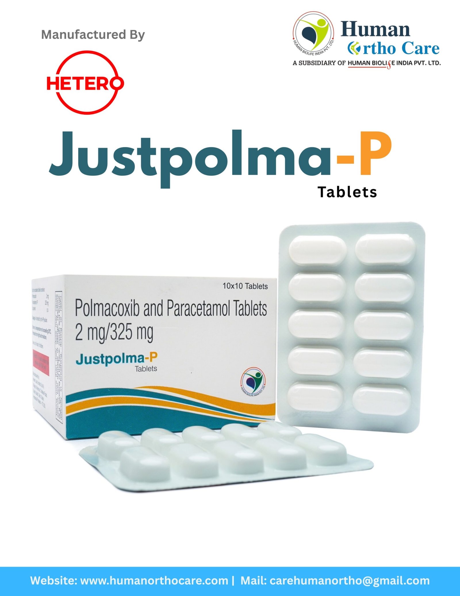 Justpolma-P is a high-performance combination analgesic engineered to provide multi-dimensional relief from moderate to severe musculoskeletal pain. By integrating Polmacoxib, a selective COX-2 inhibitor, with Paracetamol, this medication offers a synergistic “double-action” effect that targets both localized inflammation and central pain pathways. It is exceptionally effective for managing acute flare-ups of osteoarthritis, intense muscle pain, and post-operative recovery where rapid comfort is essential. While Polmacoxib works to reduce swelling and joint stiffness at the source, Paracetamol provides an immediate antipyretic and analgesic boost, ensuring comprehensive pain control. This combination is designed to offer superior efficacy with a lower risk of the gastrointestinal side effects typically associated with non-selective NSAIDs. Justpolma-P stands as a premium treatment option in the Human Orthocare line, prioritizing fast recovery, enhanced mobility, and patient safety under professional medical supervision.